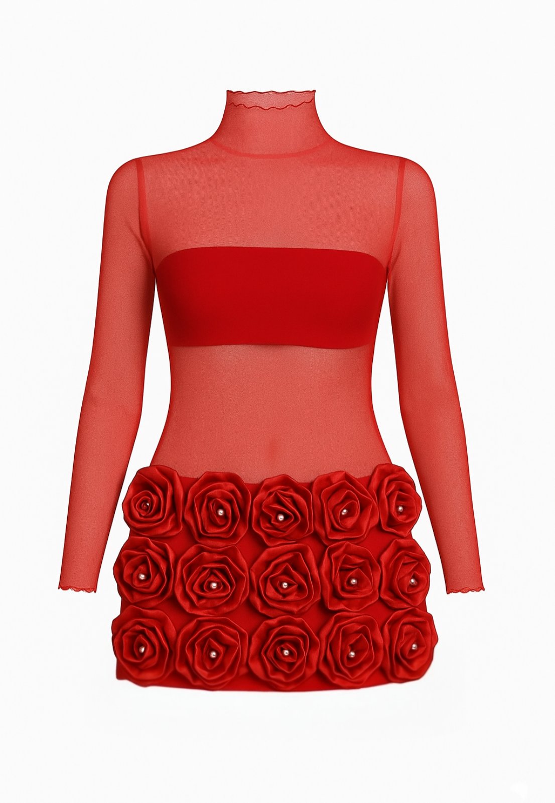 Къса рокля, изработена от еластична мрежа, с лека прозрачност. Декорация от ръчно ушити рози от сатен, с перли в средата и еластичен хастар в областта на бюста и долната част. Наситен червен цвят.