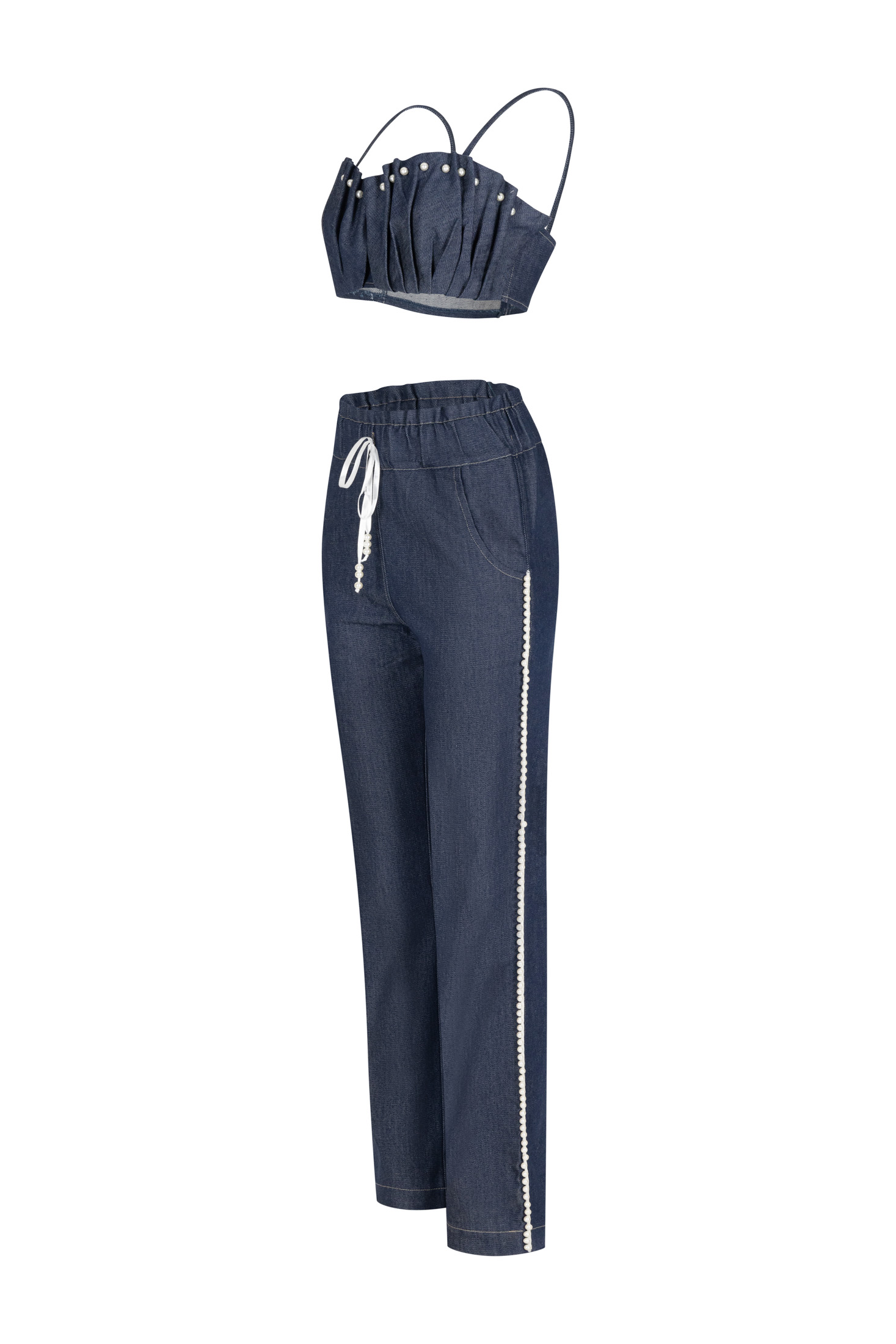 Панталон, изработен от деним, декориран по цялата му дължина с перли, с ластик в талията за по-голямо удобство и връзки , отново украсени с перли.
