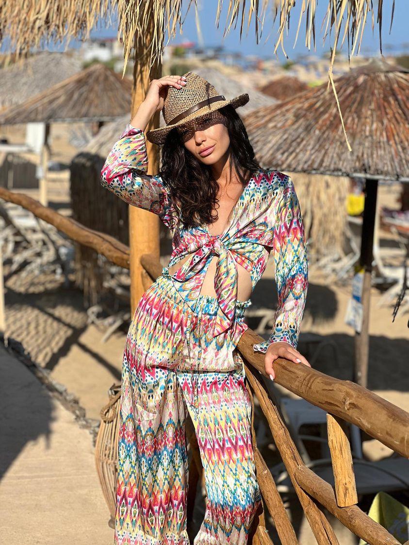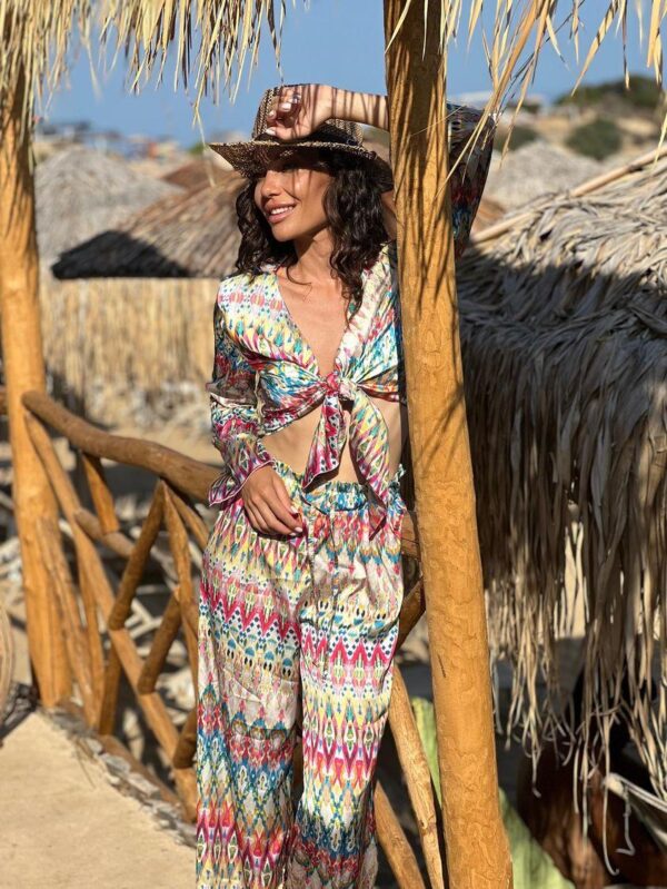 Модерен сет от две части в актуален и цветен етно стил. Ризата е със завръзване , а панталона с ластик и връзка. Удобна кройка, свободен стил.