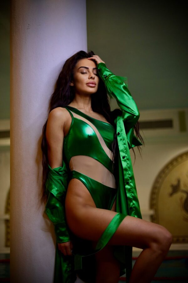 Цял бански / боди , Green Wave , изработен от телесна еластична мрежа и еластичен материал с блясък в наситено зелено. Модерен дизайн, хастар на вътрешната част, бързосъхнещи, меки и удобни материи, подходящ както за бански, така и за атрактивно боди.